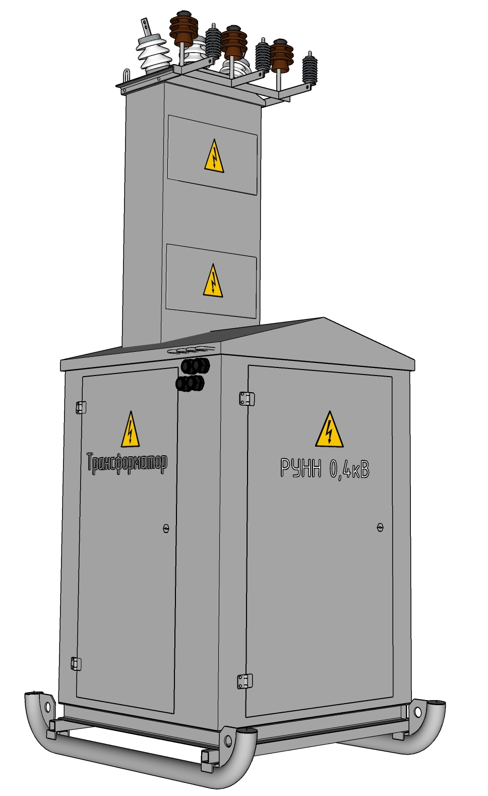 - Строповка: В салазках предусмотрены специальные отверстия в металлических пластинах (проушинах), за которые можно зацепить стропы подъемного крана для погрузки, разгрузки и установки подстанции на фундамент.